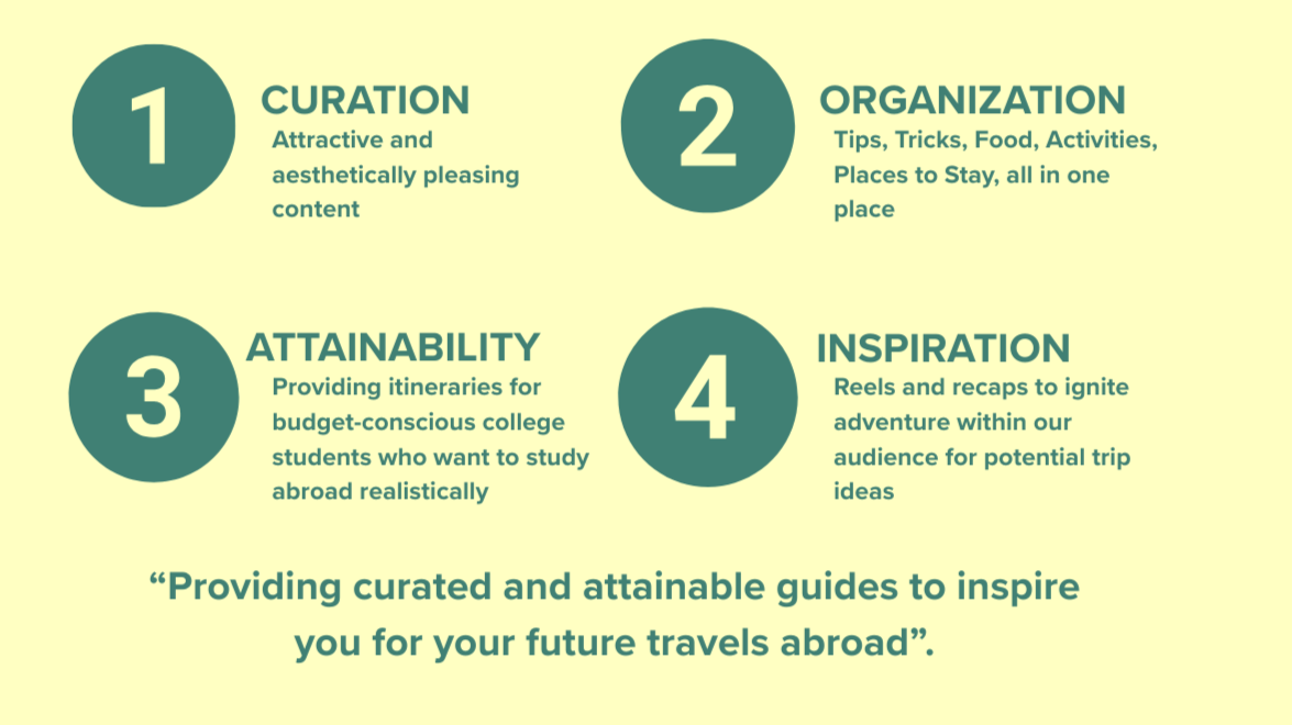 After researching a variety of channels, we decided on using Instagram as our primary platform to build the Pinpoint Pals brand. Ultimately, Instagram’s combination of young demographics, travel-friendly content format, trend-driven discovery tools, and community-building tools makes it the strongest platform for Pinpoint Pals. Because its primary user base overlaps with the study-abroad demographic, we were able to effectively use the platform to showcase our destinations, highlight travel tips, and inspire followers to go abroad. Instagram’s discoverability tools that include Reels and Explore, enhance the brand’s ability to reach new audiences interested in travel content.