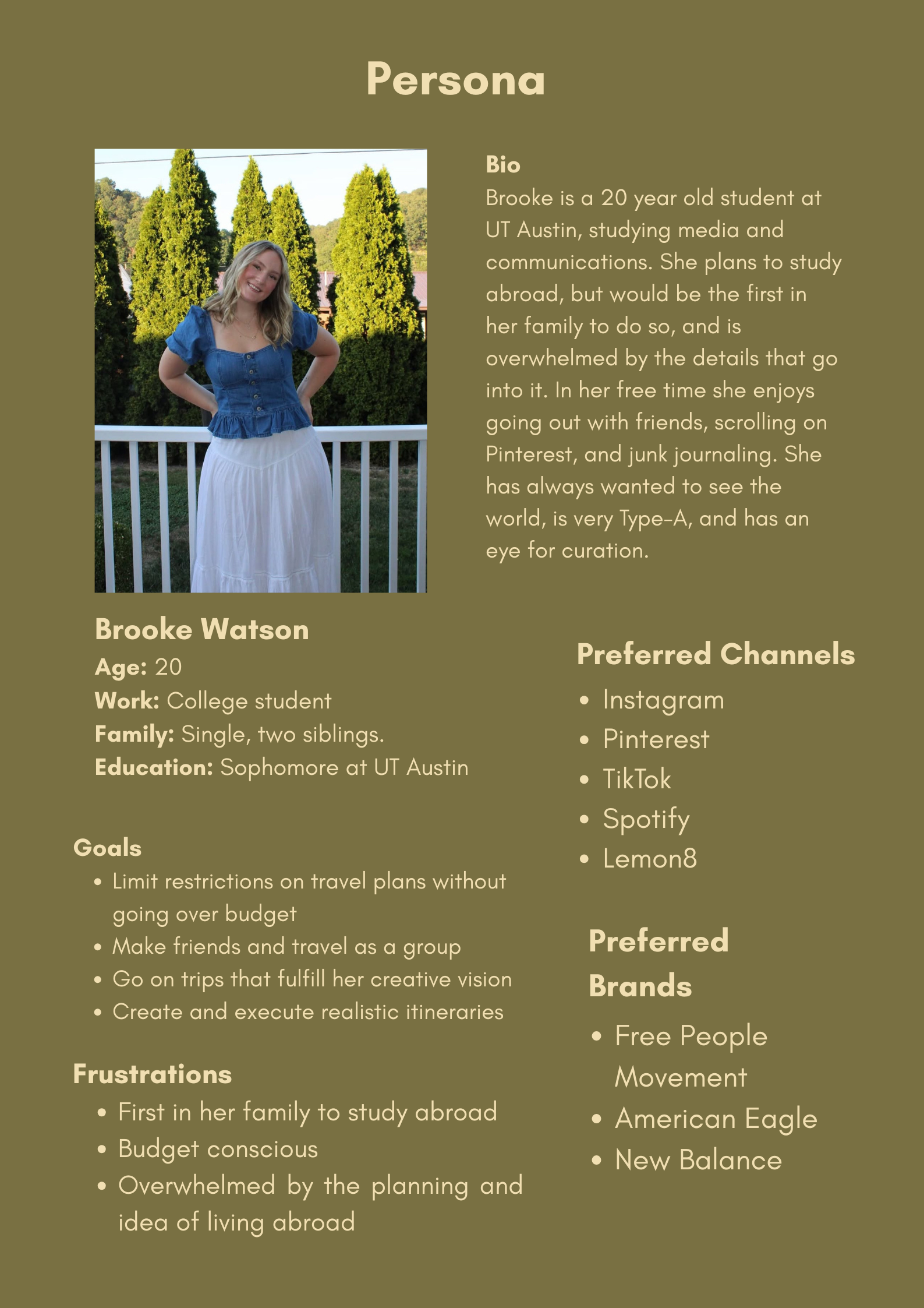 To create the most well-rounded experience possible, we outlined our ideal audience member, Brooke Watson. Brooke is a 20-year-old student at UT Austin, studying media and communications. She plans to study abroad, but would be the first in her family to do so, and is overwhelmed by the details that go into it. In her free time, she enjoys going out with friends, scrolling on Pinterest, and junk journaling. She has always wanted to see the world, is very Type-A, and has an eye for curation.